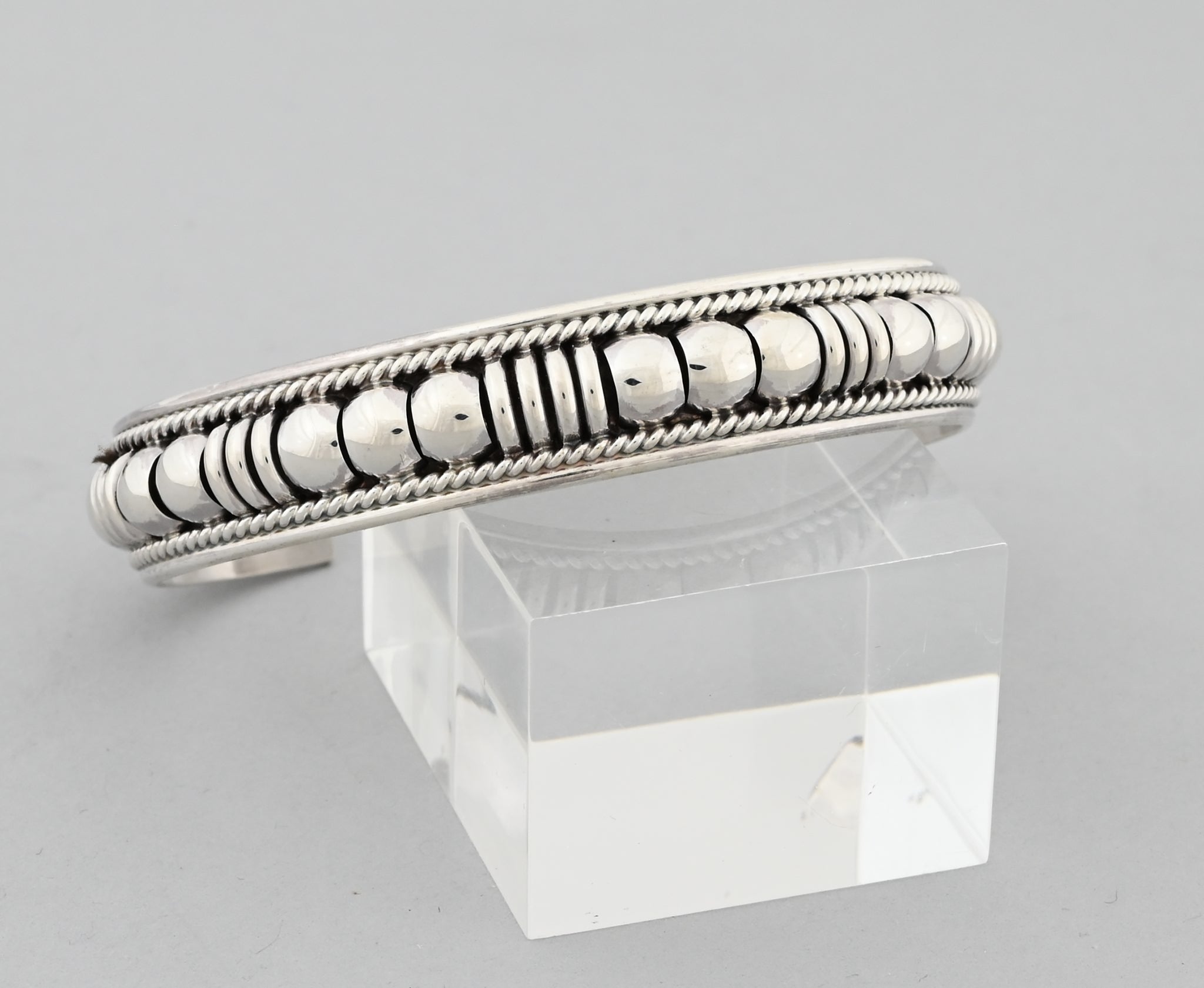 This bracelet will fit a wrist with a circumference of 6.75"; It has an opening gap of 1.25", and it can be adjusted. The band is about 1/2" wide.