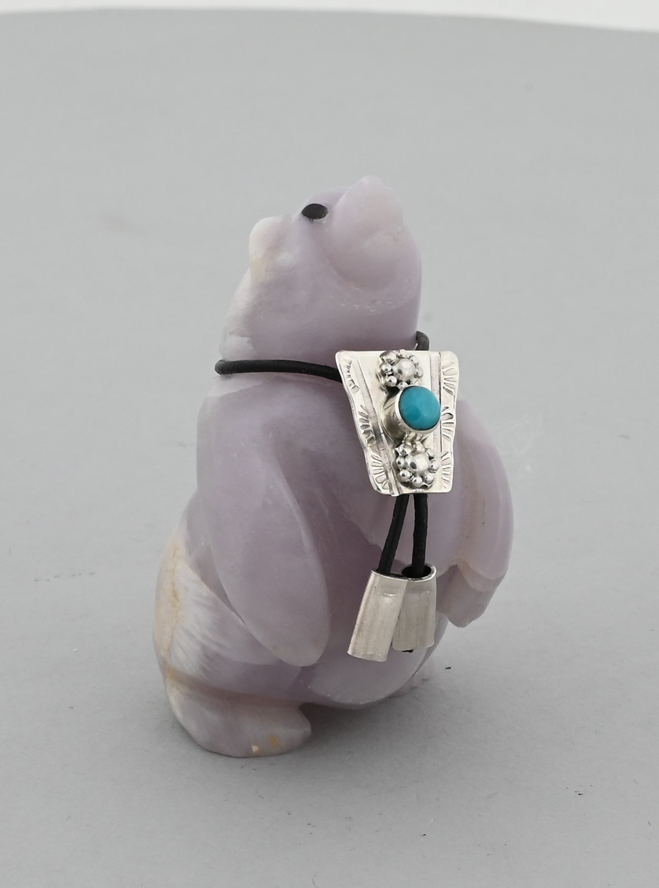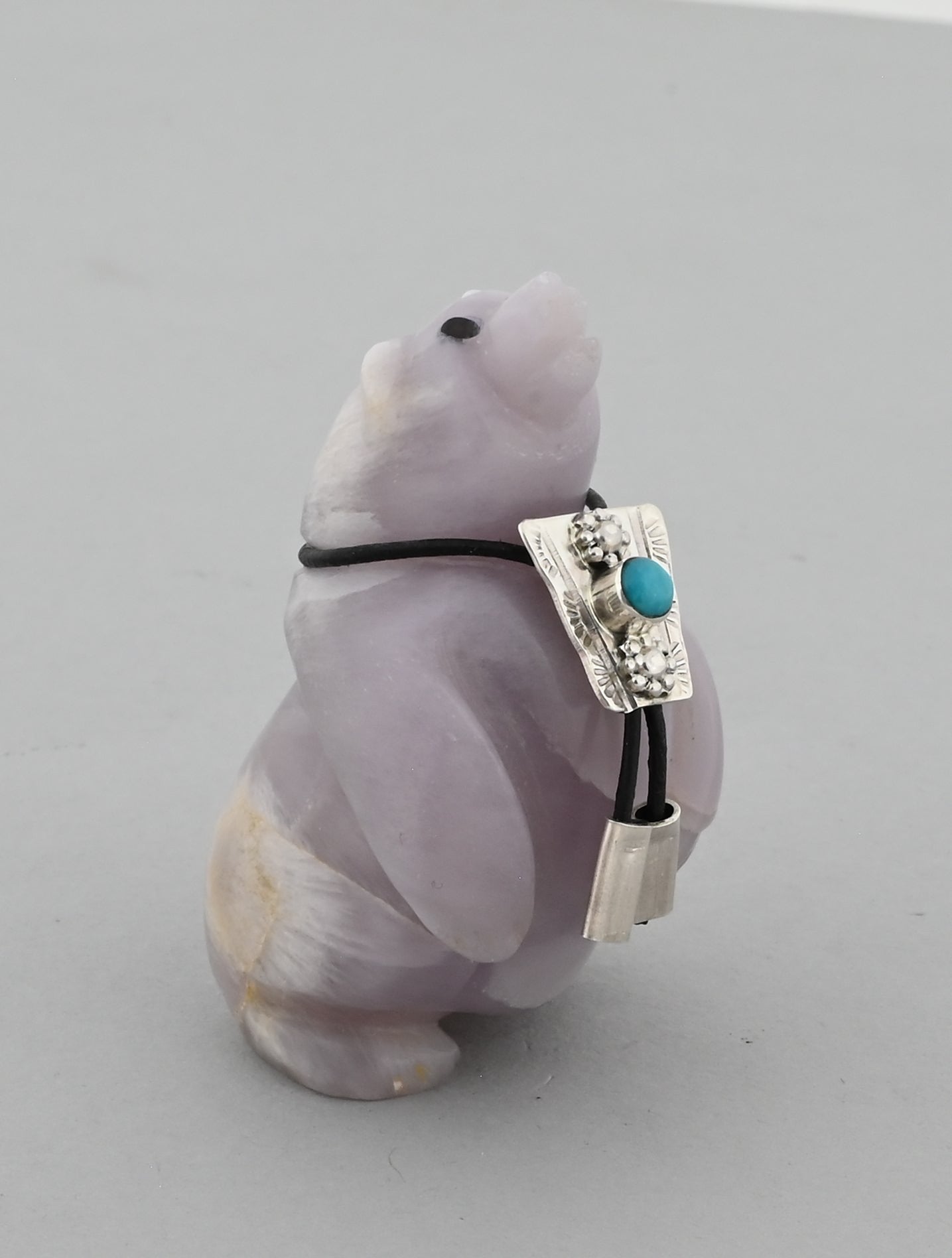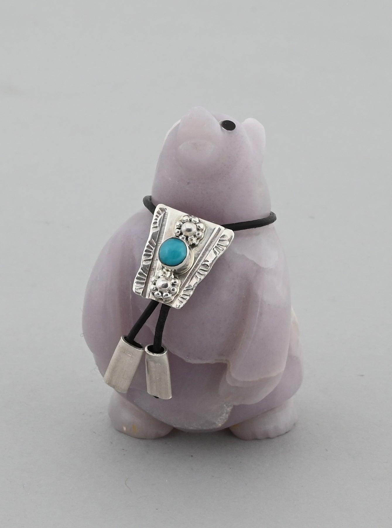 Shy Bear by Eddington Hannaweeke (Zuni Pueblo). Carved from Fluorite with a turquoise Bola Tie.