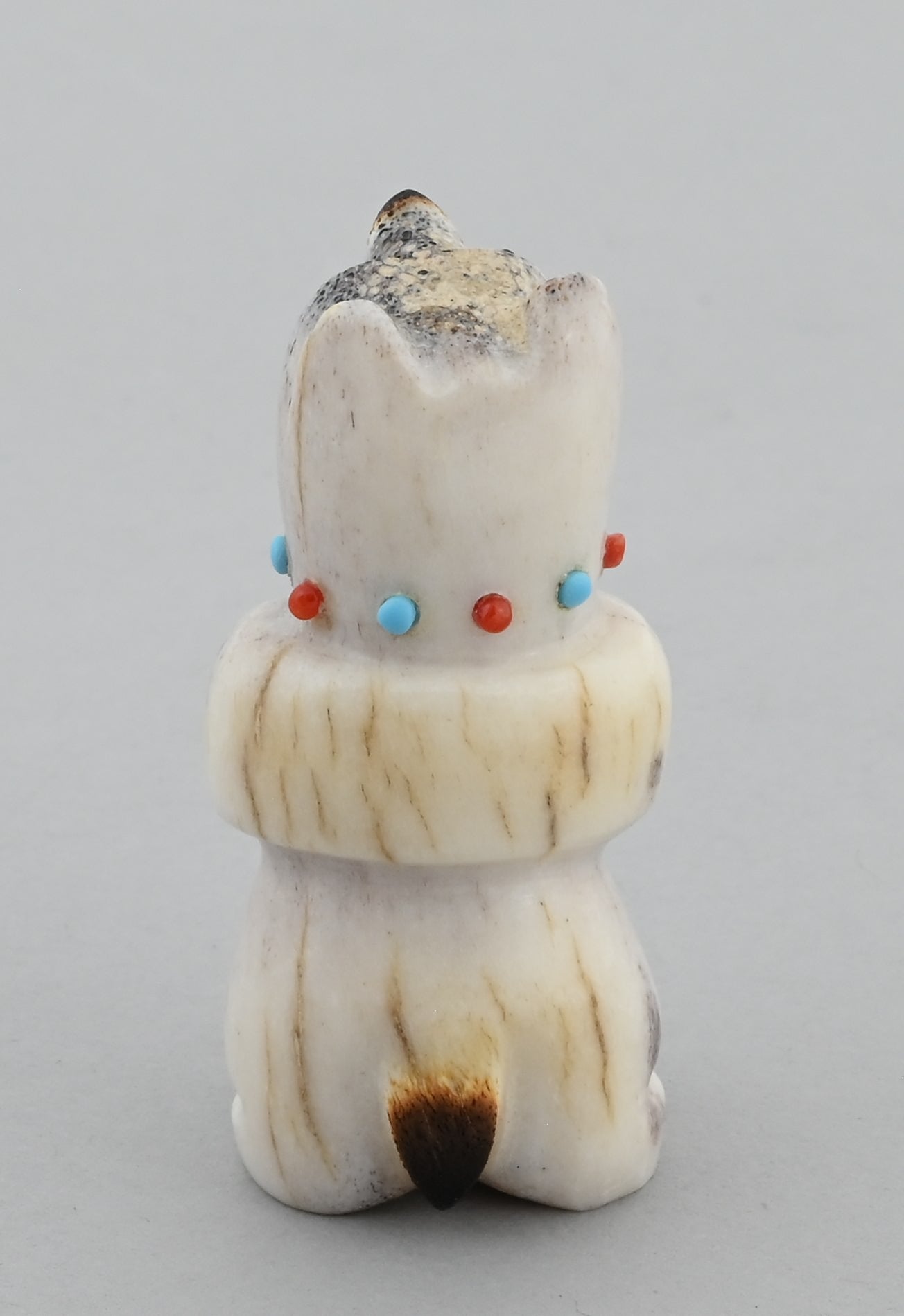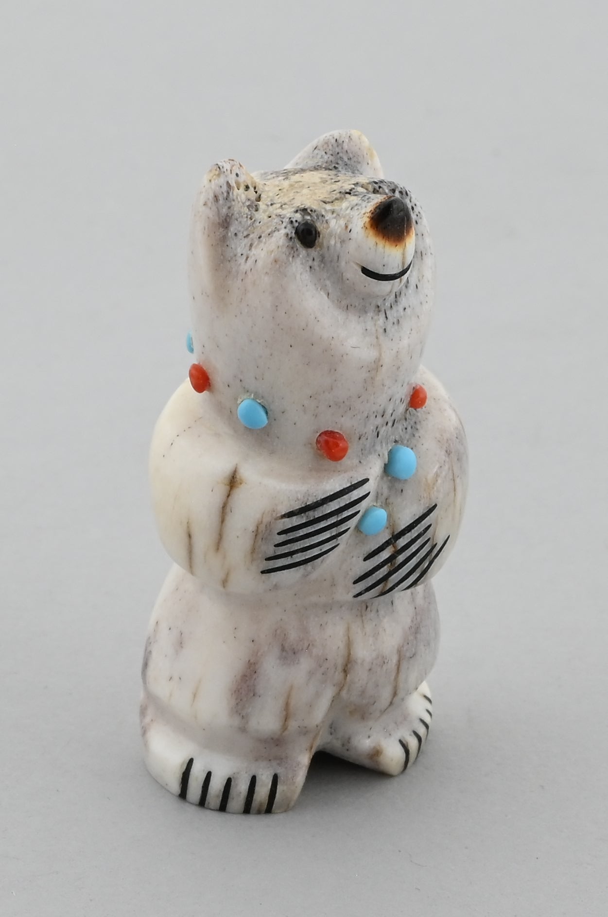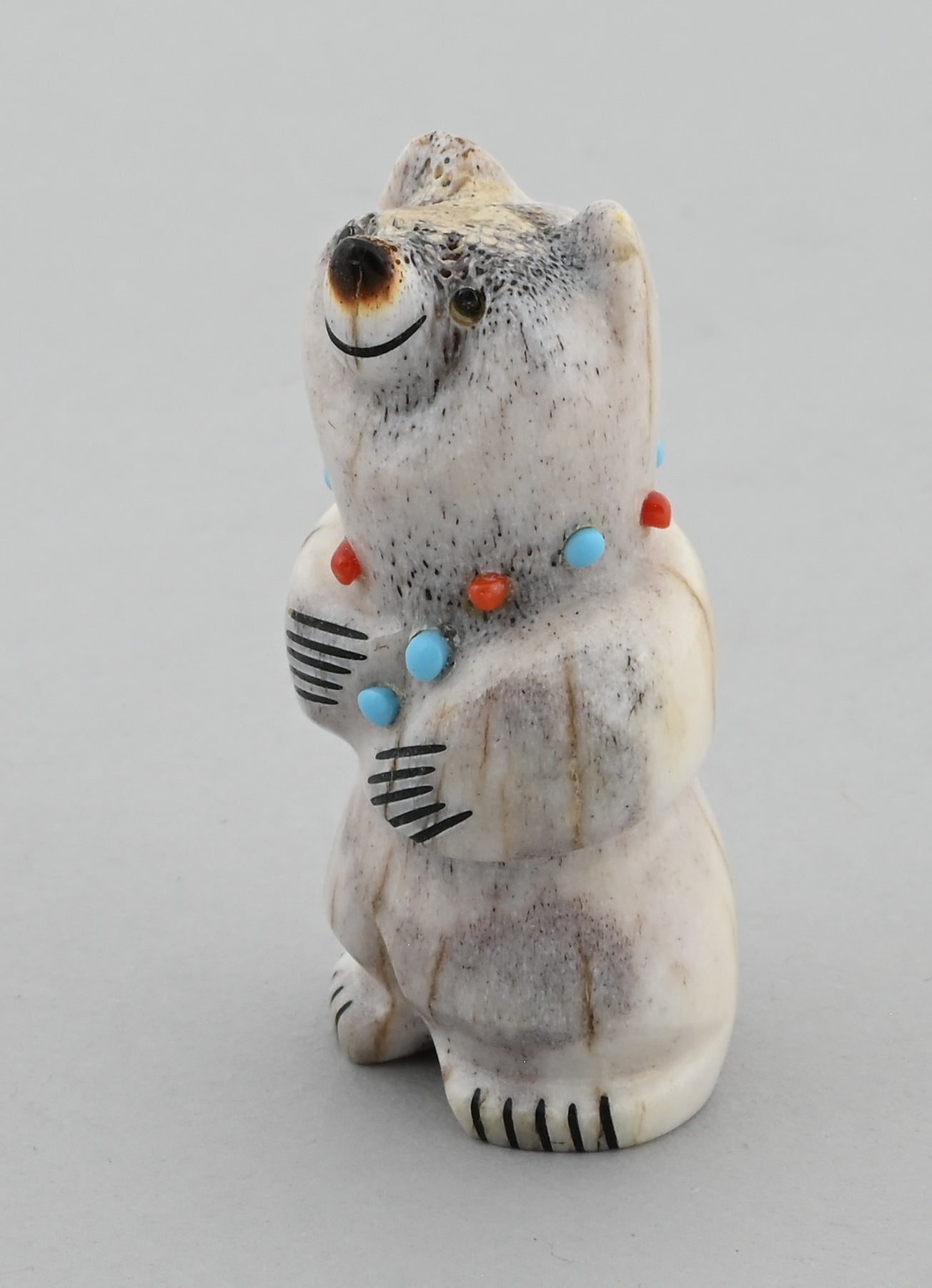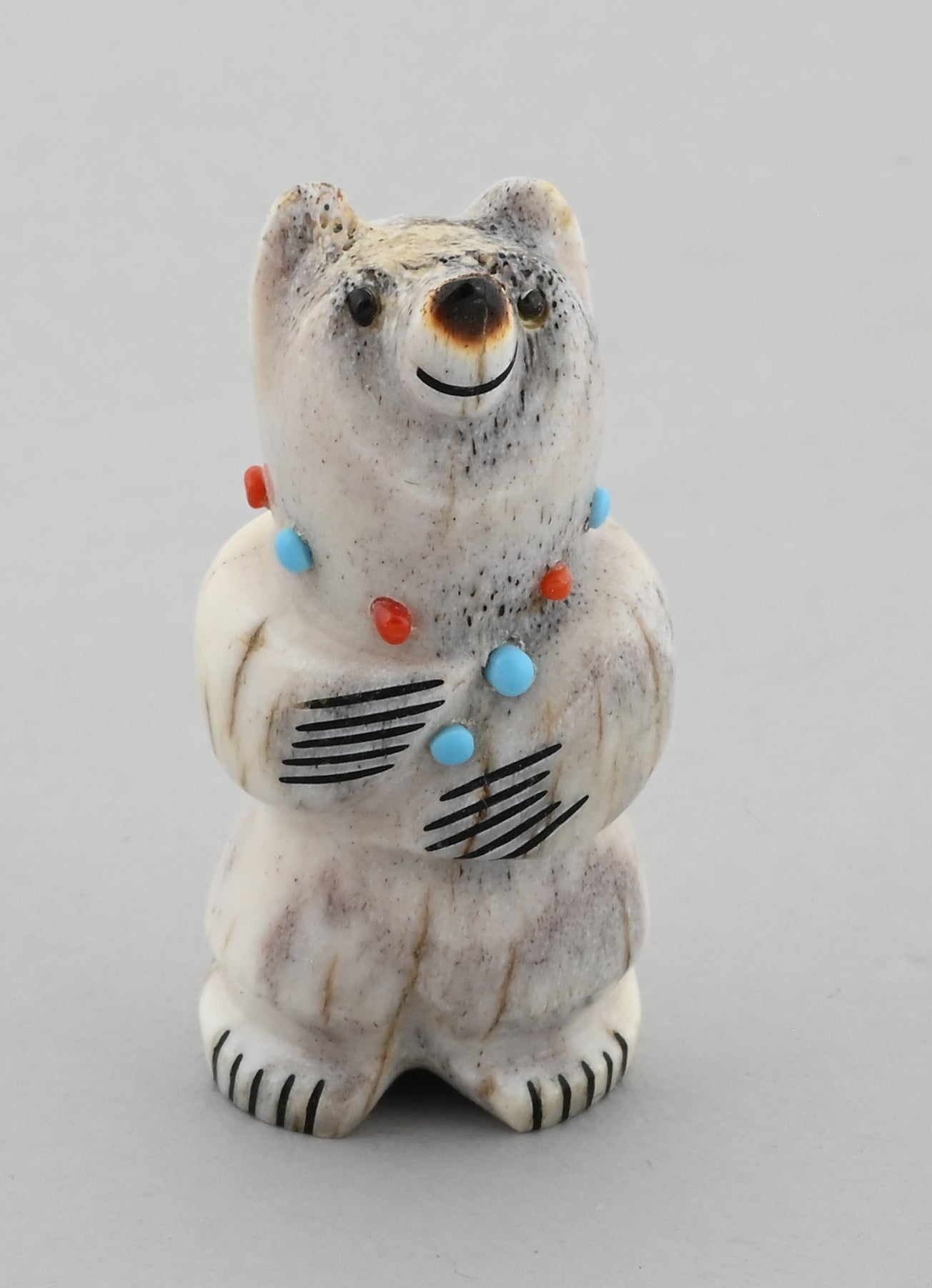 Yum Yum Bear! Looks like this one is holding its tummy after a good snack! Antler with turquoise and coral accents by Claudia Peina (Zuni Pueblo).