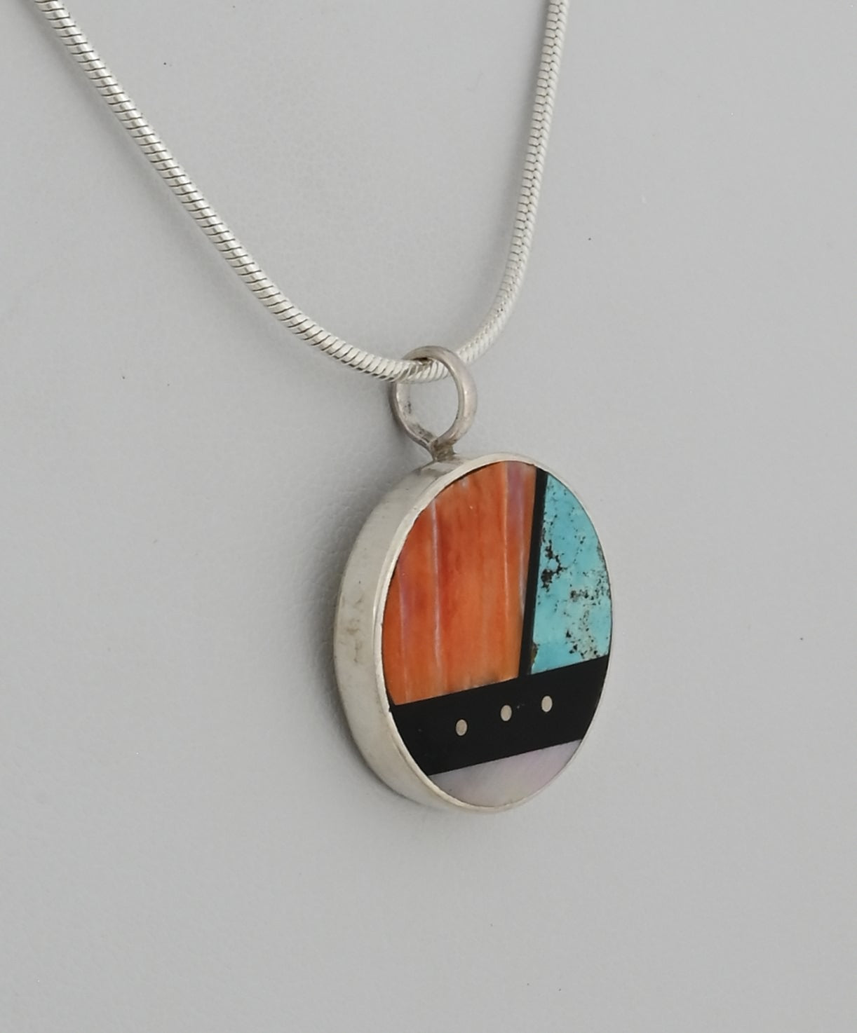 Round Inlay Pendant with Orange Spiny Oyster Shell, Turquoise, Mother of Pearl and Silver dots, which make for an interesting, striking piece of jewelry