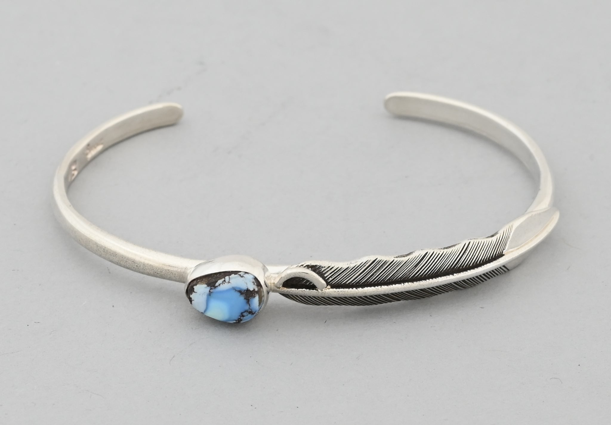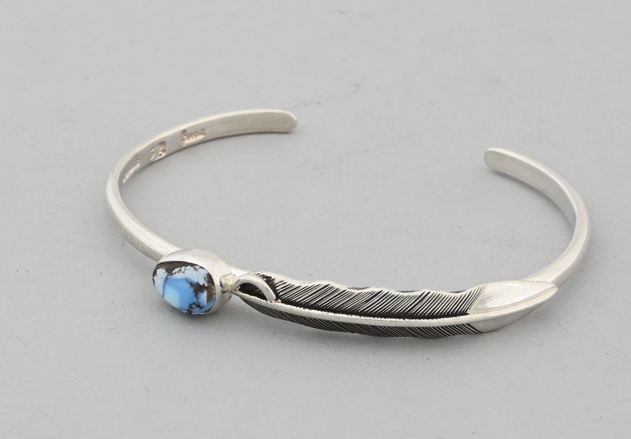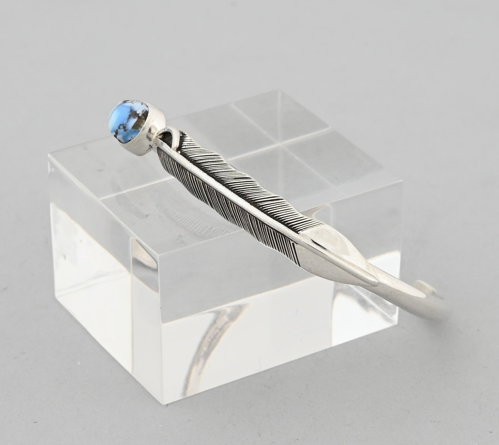Bracelet with Feather and Golden Hills Turquoise by Raymond Coriz (Navajo)